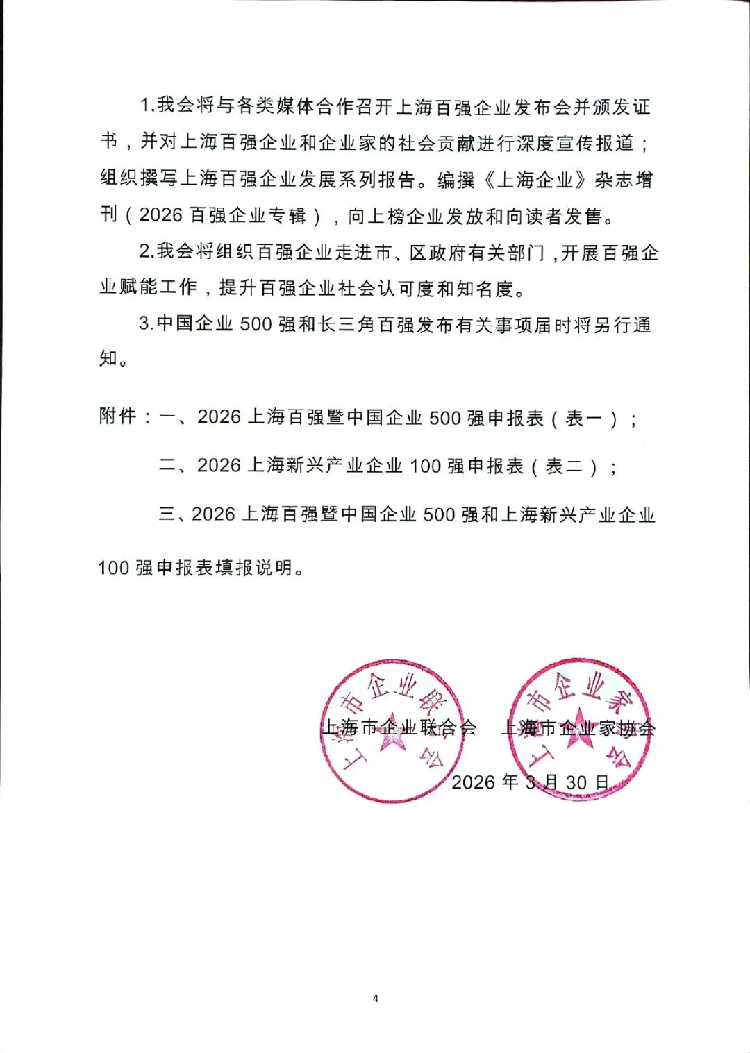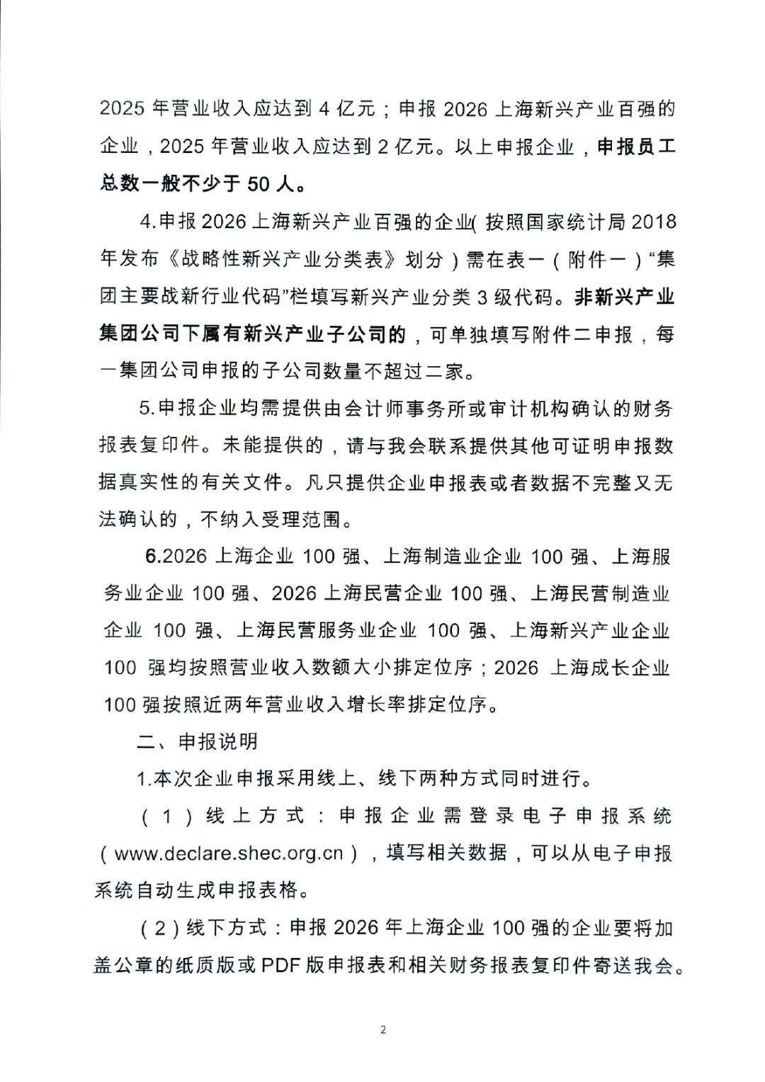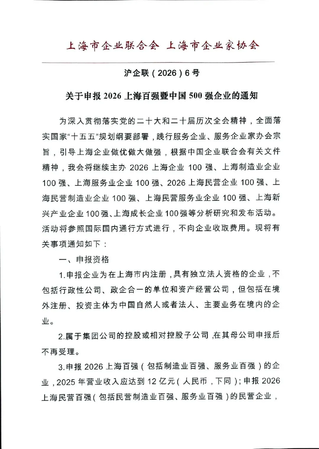2026上海百强及中国500强企业申报工作现已启动。凡2025年营收达到相应标准(百强12亿元、民营百强4亿元、新兴产业2亿元)的在沪注册企业,可于5月31日前通过线上或线下方式免费申报。申报涵盖上海100强、上海民营100强、上海新兴产业100强等多个类别,欢迎符合条件的企业积极参与。申报表及填报说明附件可扫二维码下载。