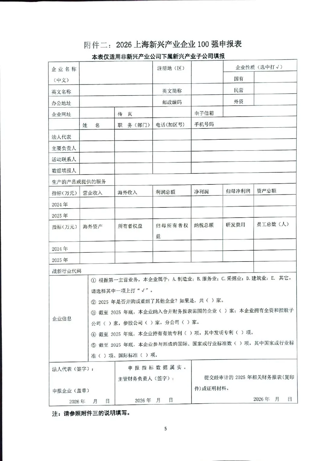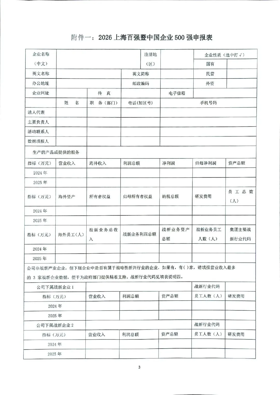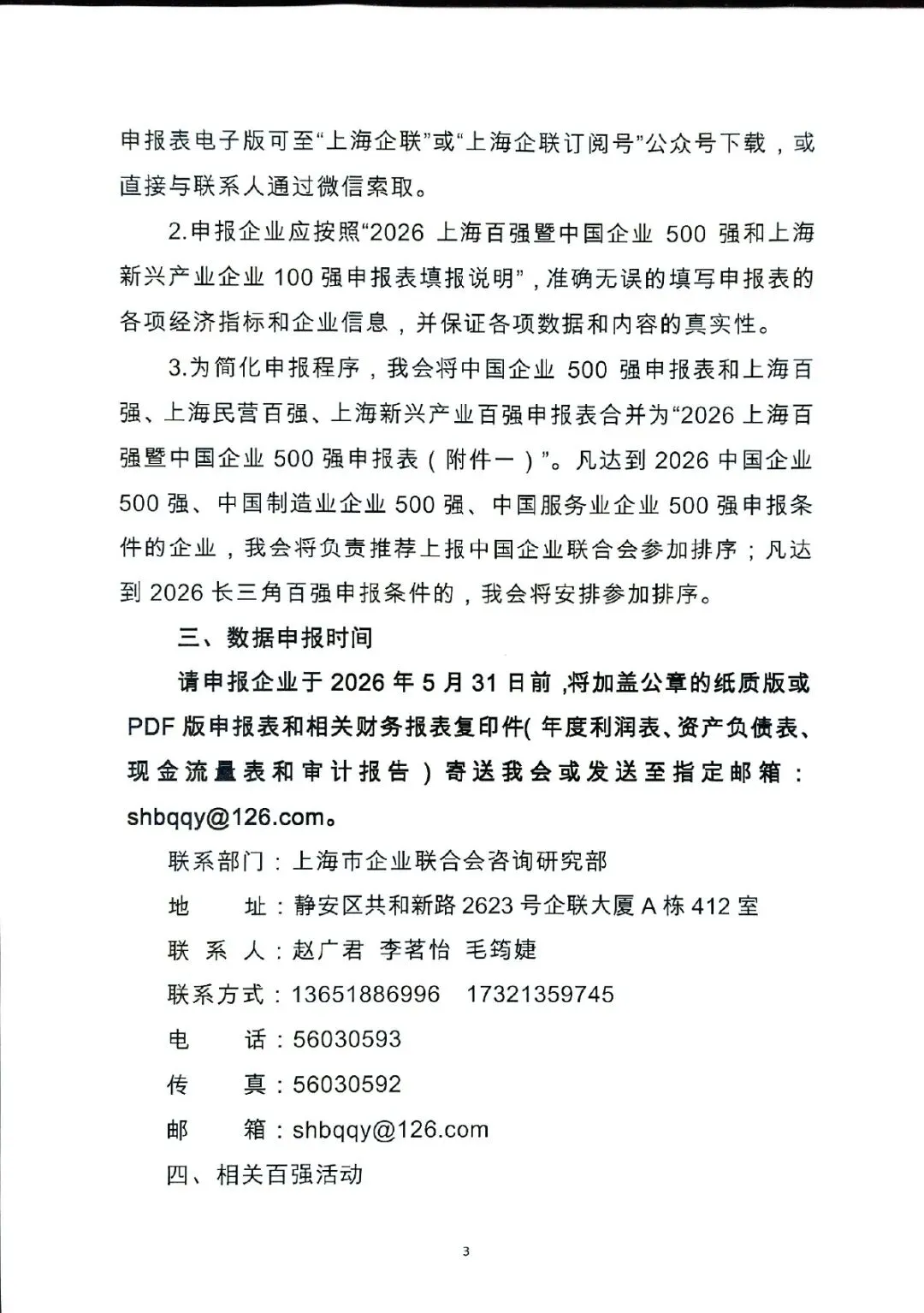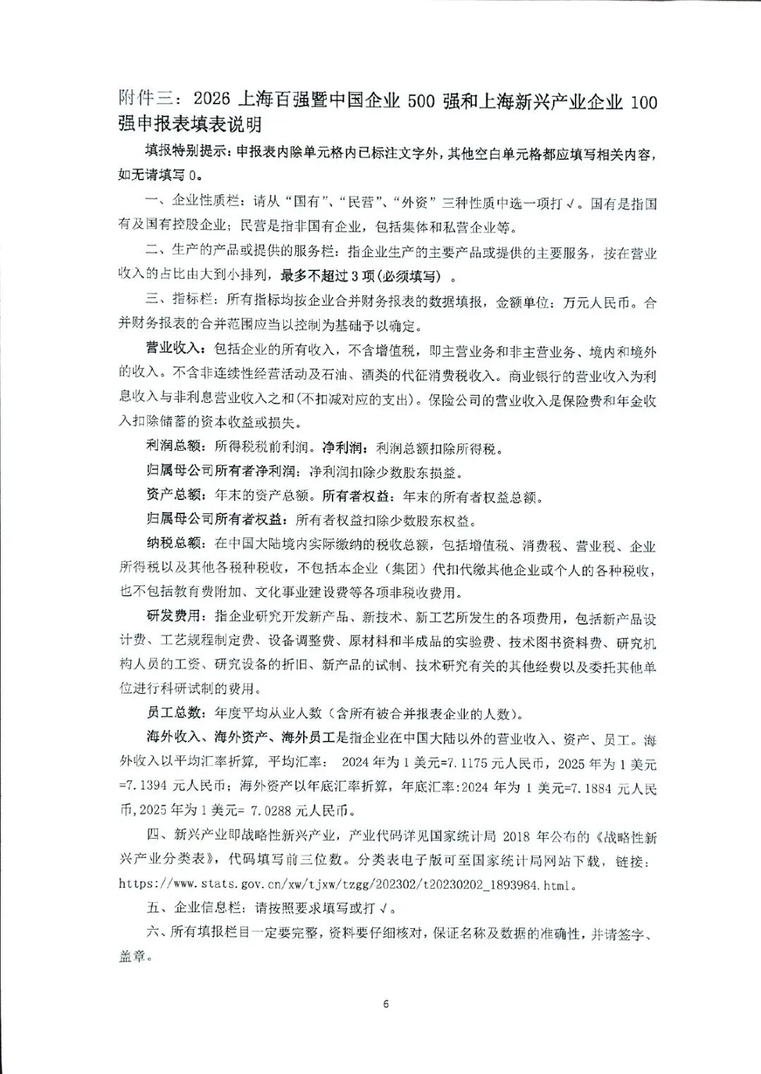 2026上海百强及中国500强企业申报工作现已启动。凡2025年营收达到相应标准(百强12亿元、民营百强4亿元、新兴产业2亿元)的在沪注册企业,可于5月31日前通过线上或线下方式免费申报。申报涵盖上海100强、上海民营100强、上海新兴产业100强等多个类别,欢迎符合条件的企业积极参与。申报表及填报说明附件可扫二维码下载。