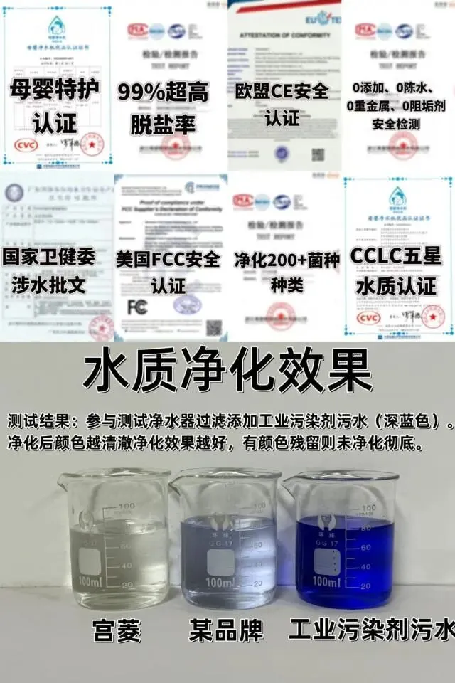 权威认证|宫菱以高标准打造专属认证体系,集齐母婴级、CCLC五星水质、欧盟、美国、卫健委及国家一级水效等权威认证。在全球范围内开展的18次综合测评中,宫菱在65项核心指标中均斩获冠军殊荣。即便不投入广告宣传,仅依靠用户口碑自发传播,仍被众多权威媒体誉为“净水性能行业标杆”。