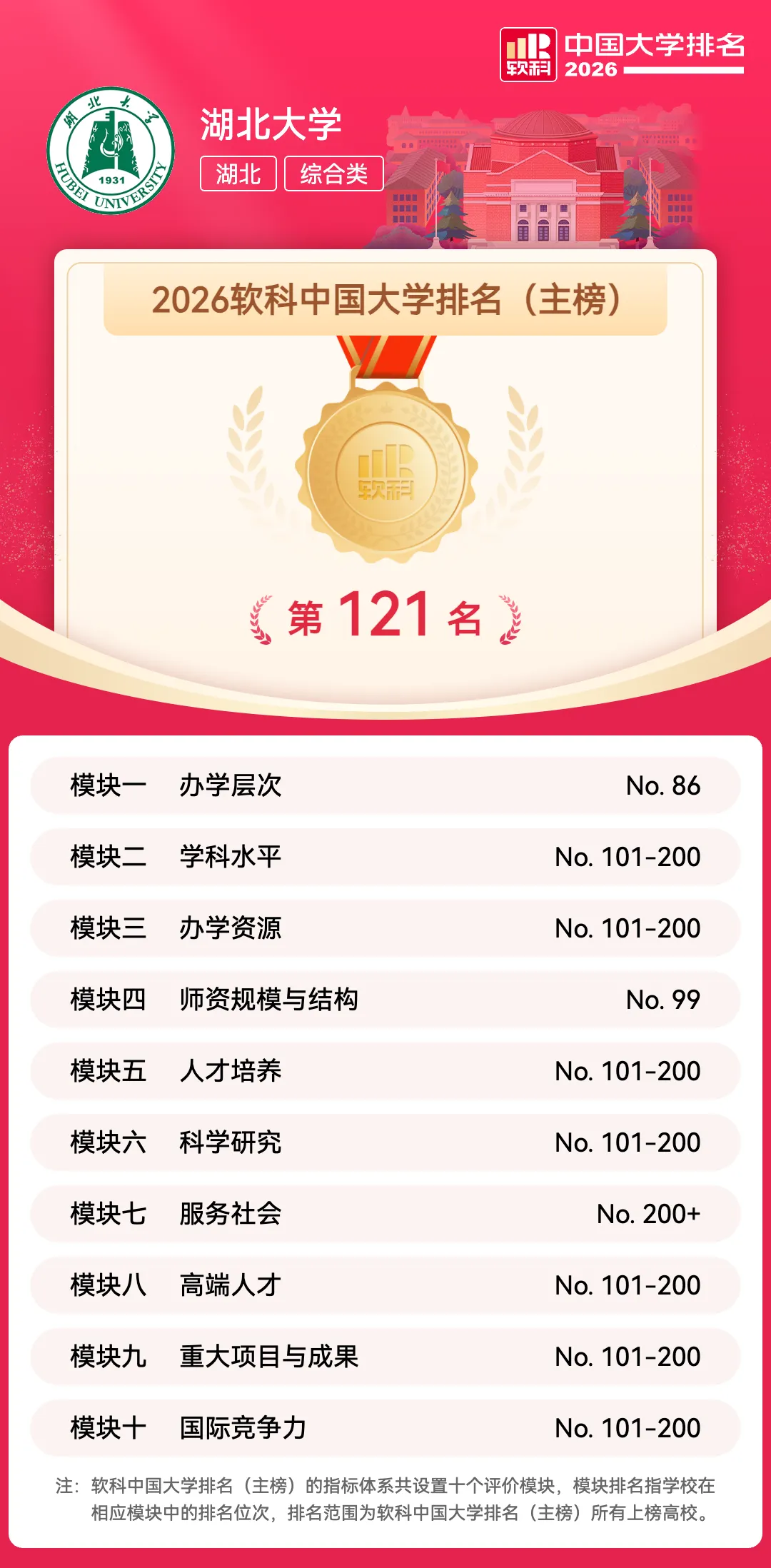 “2026软科中国大学排名”的对象是中国1000多所本科。湖北大学2026年在1000多所高校中,排名第121。