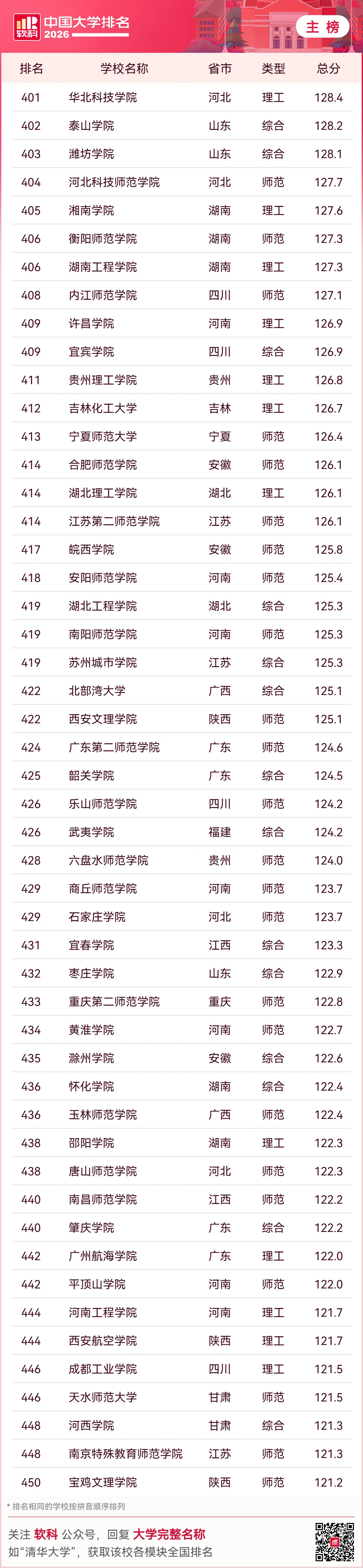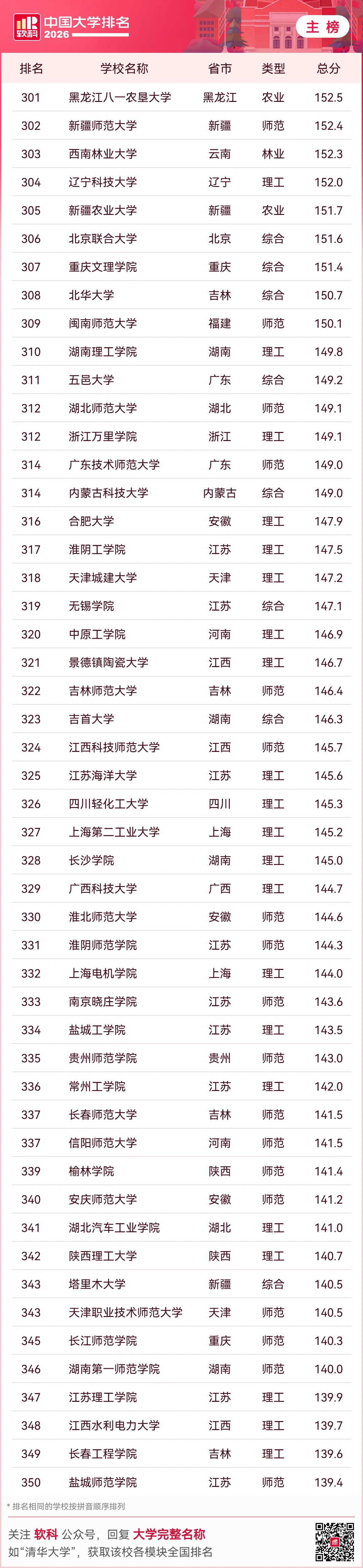 2026软科中国大学排名(主榜)的上榜高校共有590所,清华大学、北京大学、浙江大学连续12年蝉联全国三甲。