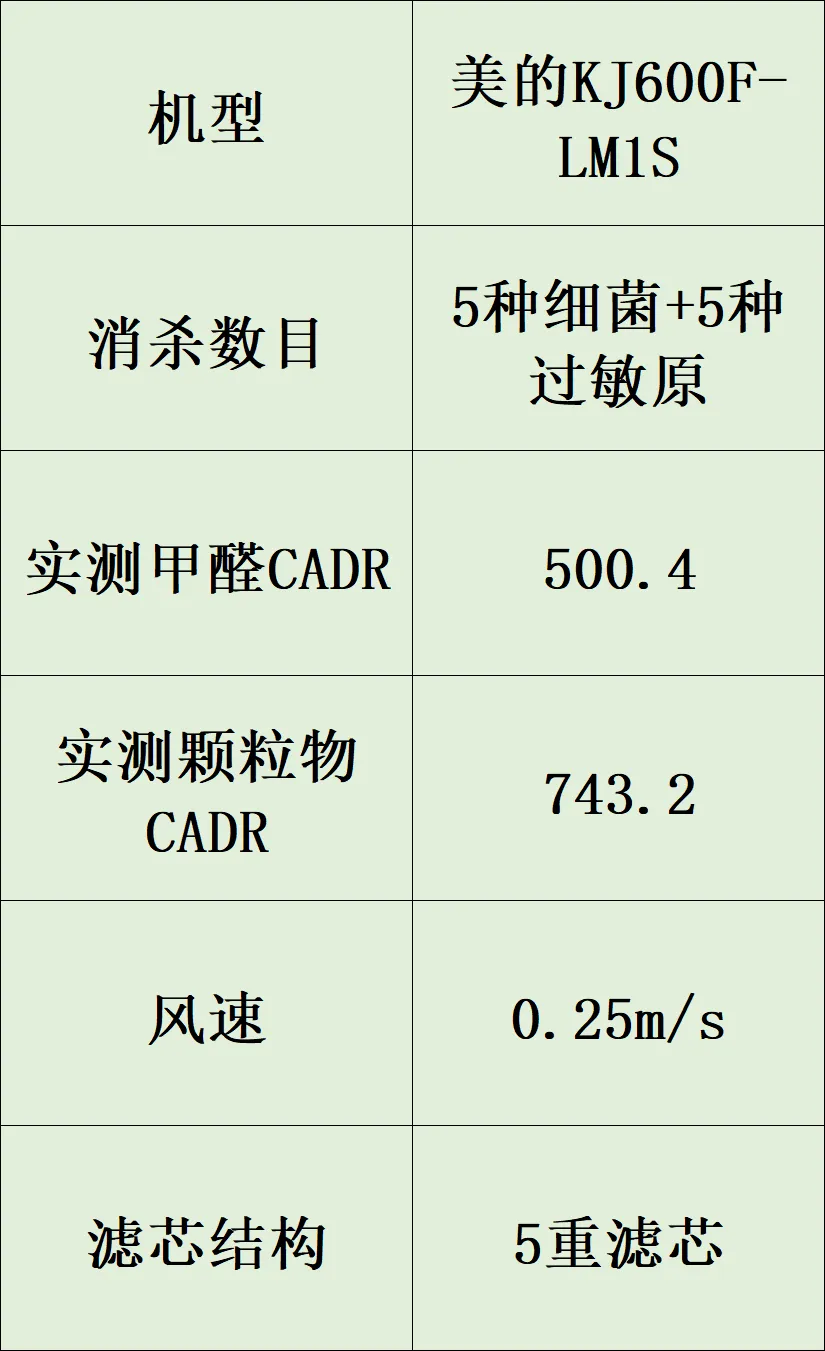 采用H13级HEPA滤网+活性炭复合滤芯,甲醛CADR实测500.4m³/h,颗粒物CADR743.2m³/h,满足70㎡左右户型净化需求,基础净化效果达标。