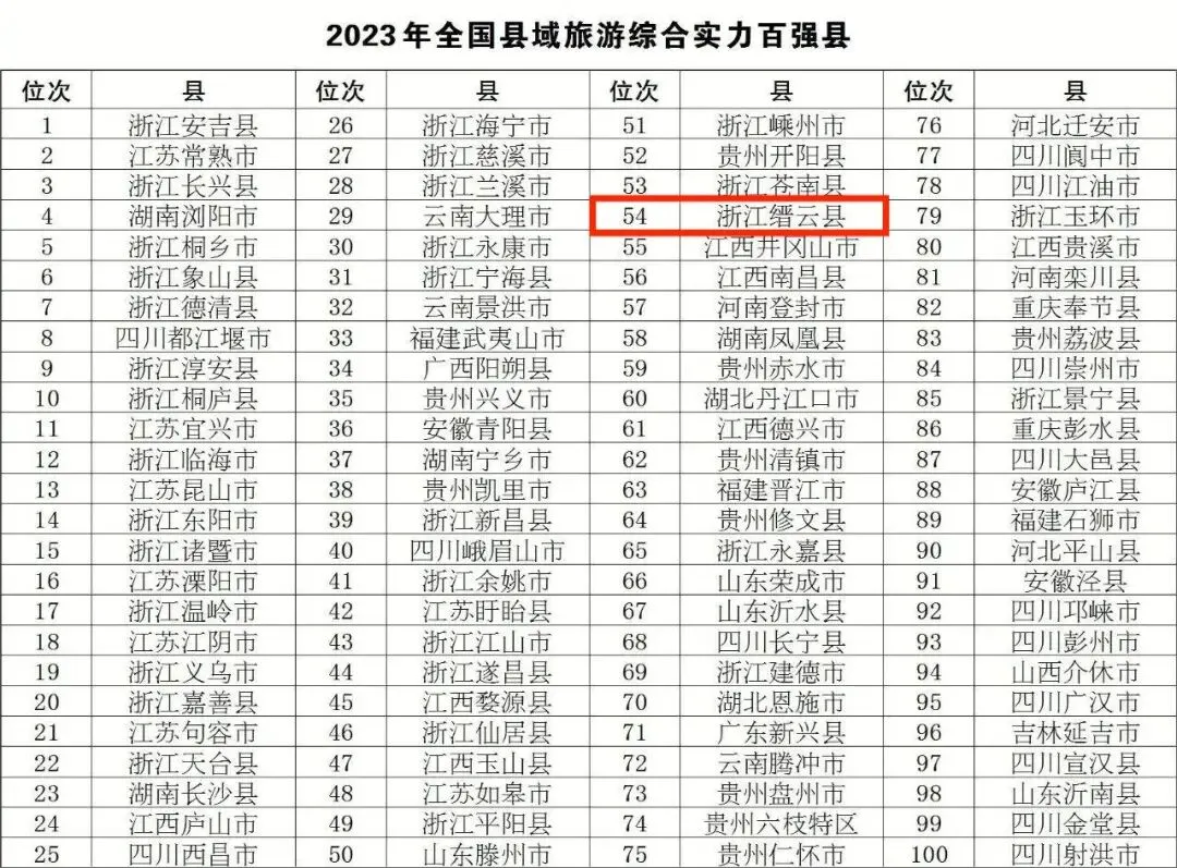 “2023年全国县域旅游综合实力百强县”名单
