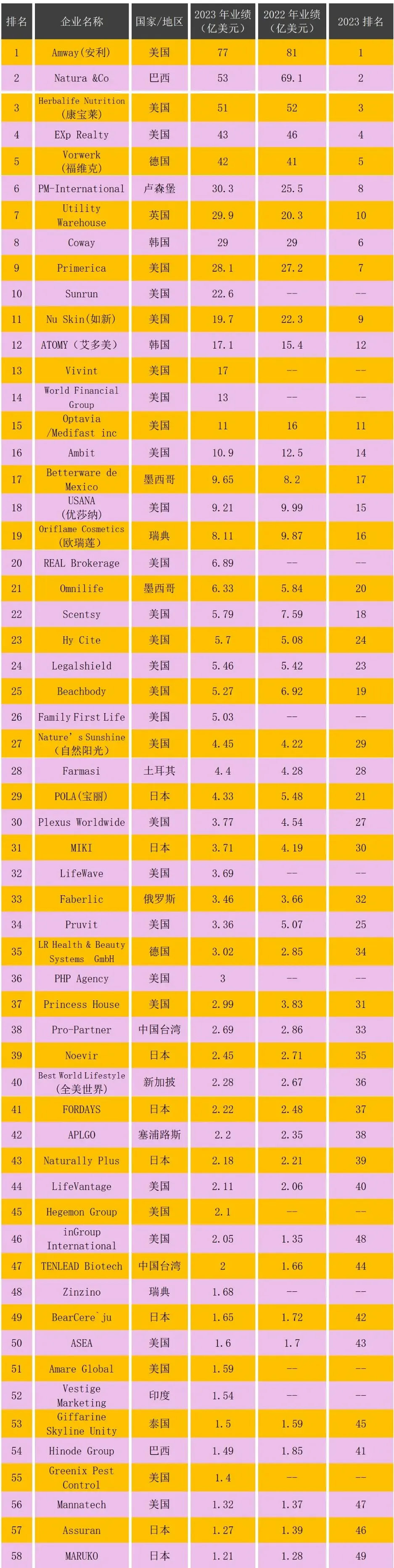 近日,DSN公布了2024年全球直销百强榜单,该榜单囊括了58家在2023年营收超过1亿美元的直销公司。具体榜单如下:
