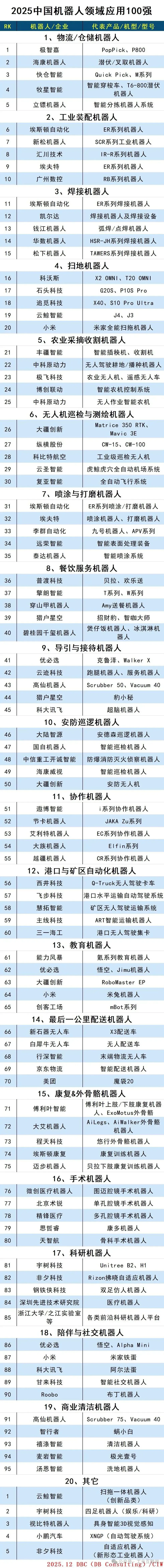 2025年12月13日消息,由中国科学院主管、科学出版社主办的商业期刊《互联网周刊》(CIW)联合德本咨询(DBC)发布了“2025中国机器人领域应用100强”。科创企业,欢迎入驻 链主智谷