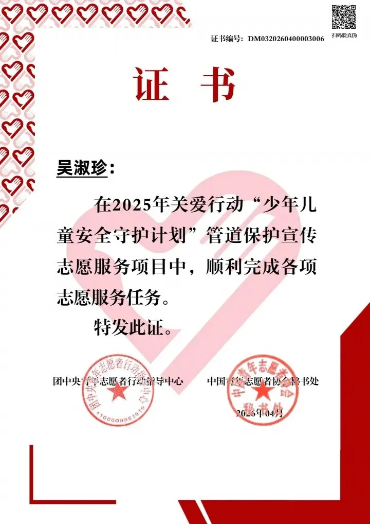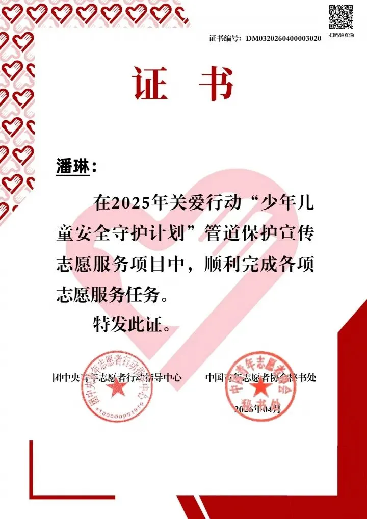 近日,我院“管”爱童行青年志愿宣讲团在2025年关爱行动“少年儿童安全守护计划”管道保护宣传志愿服务项目中圆满完成各项志愿服务任务,成功斩获全国嘉许证书!自团中央青年志愿者行动指导中心、中国少年儿童新闻出版总社有限公司联合国家石油天然气管网集团有限公司启动该项目以来,我院“管”爱童行青年志愿宣讲团积极响应号召,勇担青年使命,以高度的责任心和使命感推进宣讲活动,从全国1000支立项团队中脱颖而出,成功斩获“优秀团队”荣誉称号,全国仅100支团队获此殊荣!