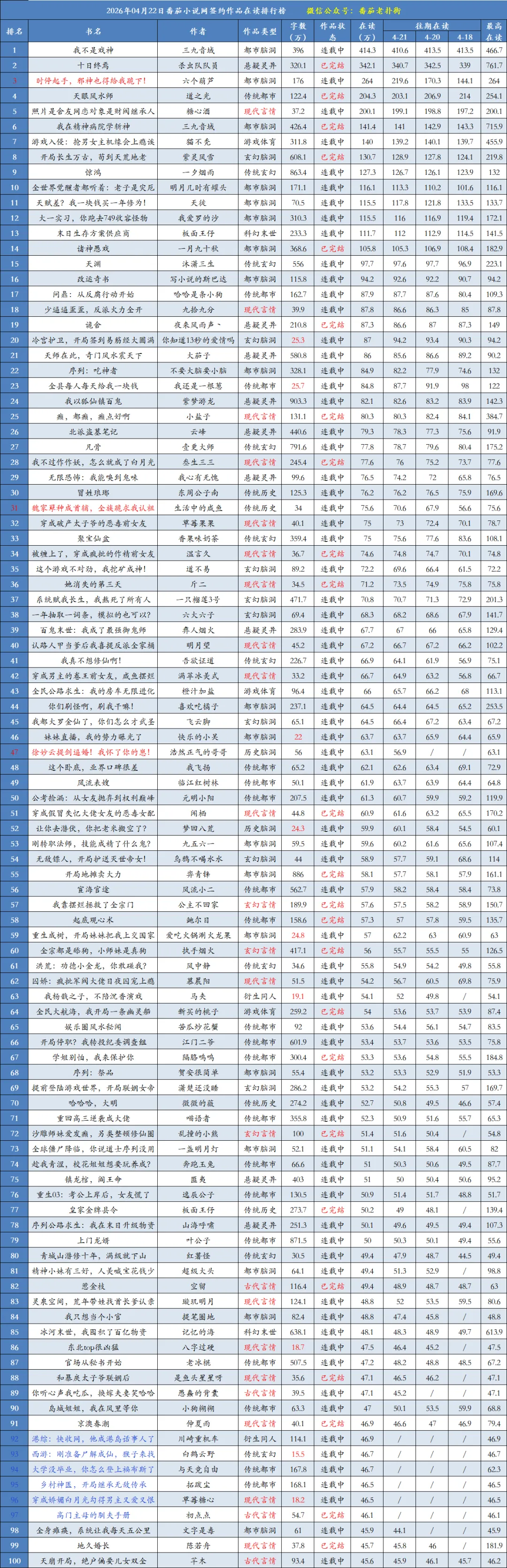 4月22日番茄在读前一百排行榜如下: