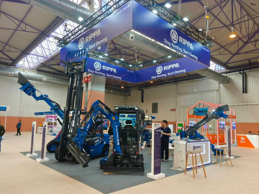 整体布局围绕设备展示为核心,陈列了品牌多款小型挖掘机、叉车等主力设备,开阔的动线设计让观众可以从多角度直观观察产品细节与作业状态,方便现场体验与咨询。