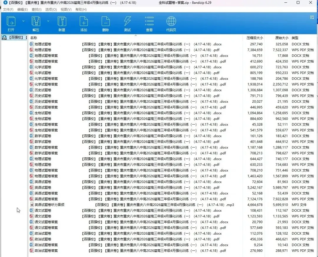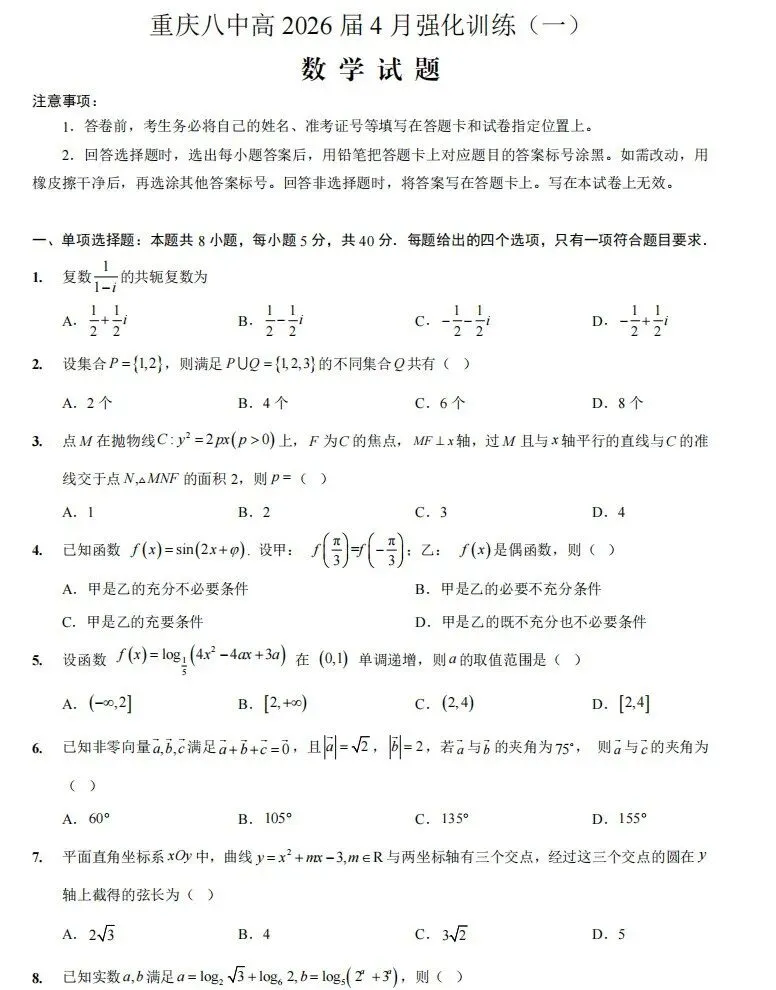 【百强校】【重庆卷】重庆市重庆八中高2026届高三年级4月强化训练(一)(4.17-4.18) 全科试题卷+答案