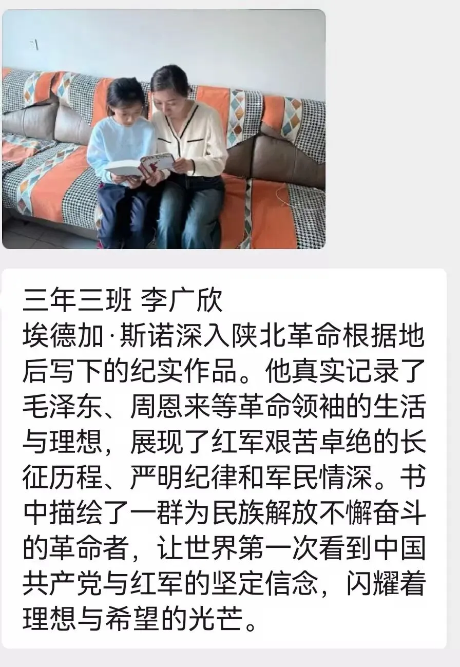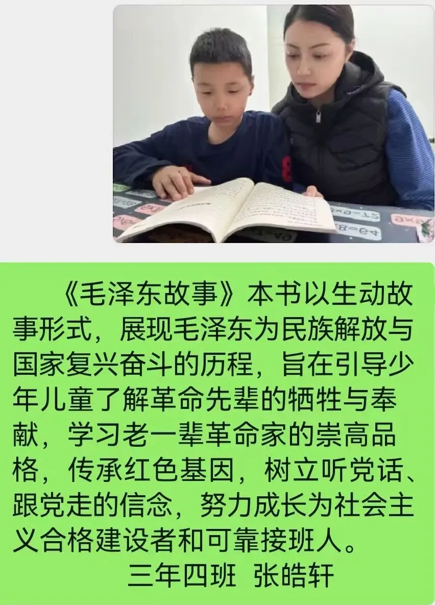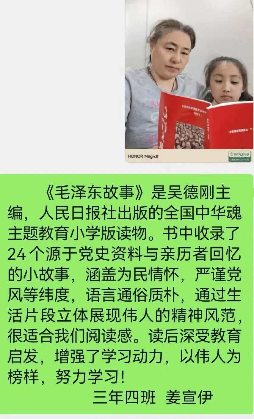 在《毛泽东故事》的共读中,革命先辈为民族解放、国家复兴不懈奋斗的光辉历程徐徐展开。在家长的引导下,孩子们走近伟大领袖,学习老一辈革命家无私奉献、艰苦奋斗的精神,树立听党话、跟党走的坚定信念,立志成长为担当民族复兴大任的时代新人。