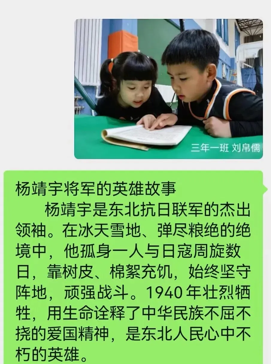 杨靖宇将军的英雄事迹,让孩子们深深动容。冰天雪地中,弹尽粮绝的他以树皮、棉絮充饥仍顽强战斗,用生命诠释中华民族不屈不挠、誓死卫国的伟大精神,让孩子们读懂英雄的无畏与担当。