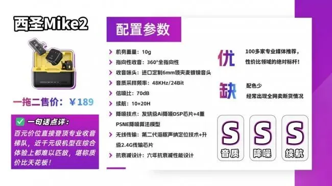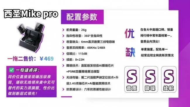 特别值得一提的是,西圣Mike Pro凭借卓越的收音效果和稳定的信号传输,自面市以来在众多音频设备推荐榜单中名列前茅。据了解,西圣是较早致力于音频技术研发的品牌,有着深厚的技术积累,在无线麦克风技术实力方面的优势不言而喻。