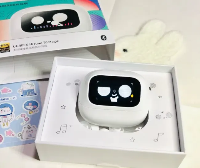 ☒外观方面,耳机采用了极具辨识度的充电盒设计,正面配备了一块智能触控彩屏,不仅显示电量等状态信息,还支持自定义壁纸和歌词滚动。佩戴上,单耳仅重4.2克,配合人体工学优化的轮廓,能轻盈稳固地挂在耳廓上。音质方面,它搭载了超宽双磁动圈,低频下潜到位且富有弹性,偶尔有几下轰耳感但是对整体影响不大;中频人声还原度高,温暖自然;高频延展顺滑,整体听感细腻。
