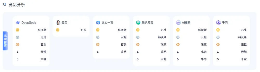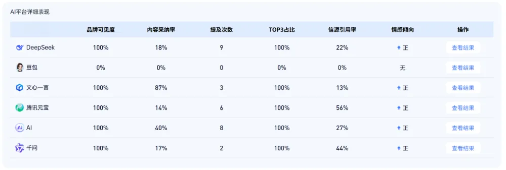 AI “千人千面” 的特性,让人工截图、手动统计彻底失效,既看不到全平台真实位次,也抓不住用户真实选择,极易误判局势、错失流量。品牌陷入了 AI 营销的「结构性盲区」:不知道哪些平台是流量洼地、不知道哪些内容能被 AI 采纳,只能凭经验盲目投放,最终在 AI 场景竞争中逐步掉队。数据系统整合全平台排名、可见度、采纳率、竞品动态,形成一张清晰作战图:- 对比各平台内容采纳率,提炼 AI 偏好的关键词与卖点结构;