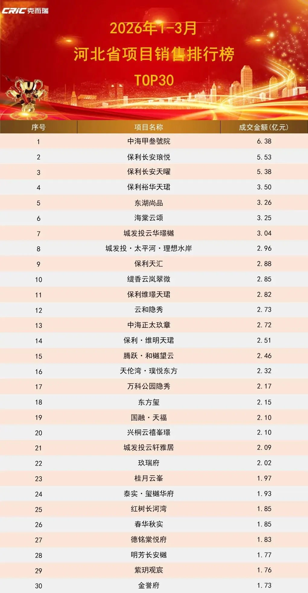 在2026年一季度河北省TOP30项目销售额榜单中,前30位成交总金额为81.91亿元,成交总面积约54.33万㎡,共计4119套。成交均价约1.6万元/㎡。
