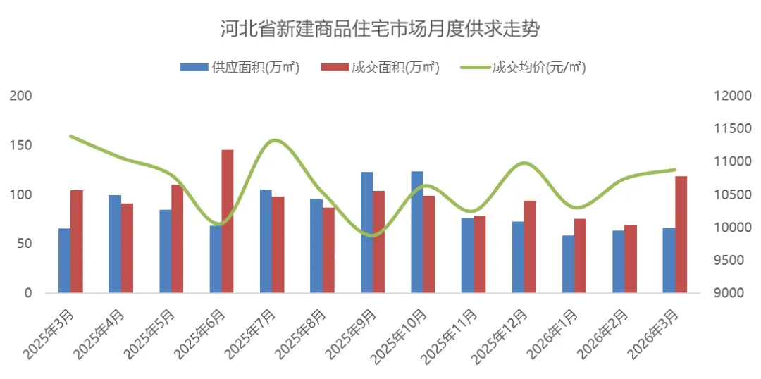 随着楼市传统旺季的到来,河北省新房市场整体呈现出量价齐升的积极态势。据CRIC环京投资决策系统显示,2026年3月河北省新建商品住宅新增供应面积66.67万平方米,环比上涨5.31%,同比上涨1.49%;成交面积118.29万平方米,环比上涨71.74%,同比上涨12.98%;成交均价为10880元/㎡,环比上涨1.27%,同比下跌4.46%。