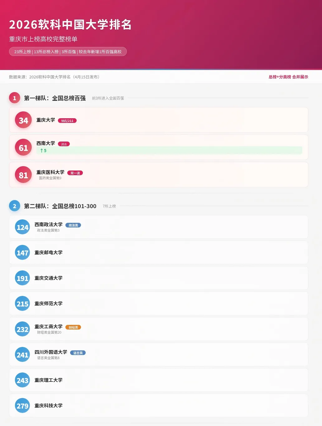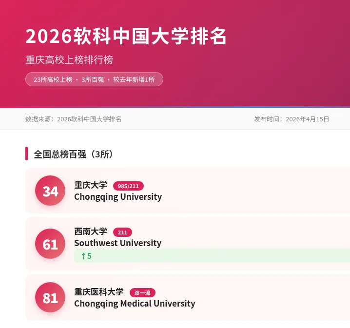 在2026软科百强榜中,重庆有3所高校上榜:重庆大学、西南大学还有重庆医科大学。