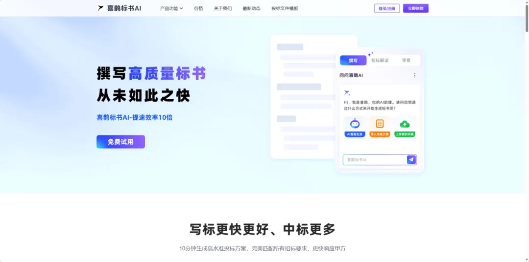 喜鹊标书在招投标文档辅助领域有着不错的积累,它的产品核心逻辑更偏向于海量范本库+基础排版辅助,适合需要大量参考资料的用户。