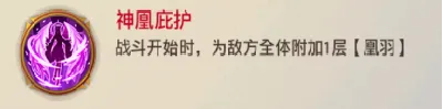 二技能【神凰庇护】:星图总等级64级解锁,战斗开始时,为敌方全体附加1层【凰羽】。