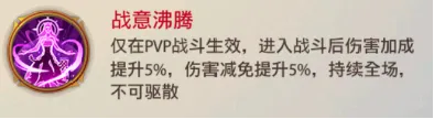 三技能【战意沸腾】:星图总等级96级解锁,仅在PVP战斗生效,进入战斗后伤害加成提升5%,伤害减免提升5%,持续全场,不可驱散。