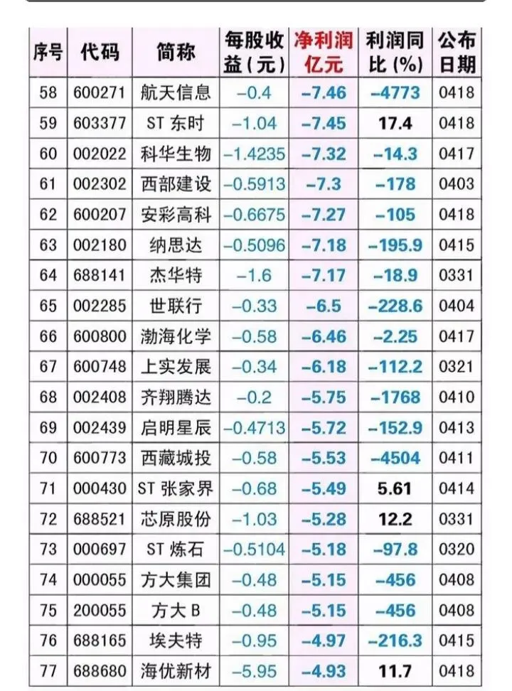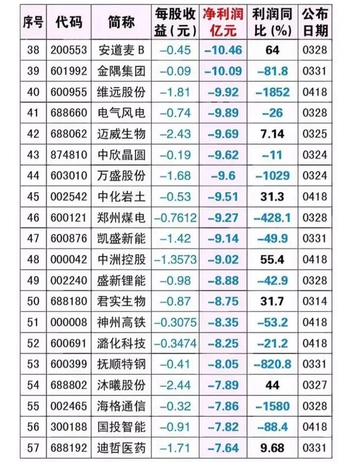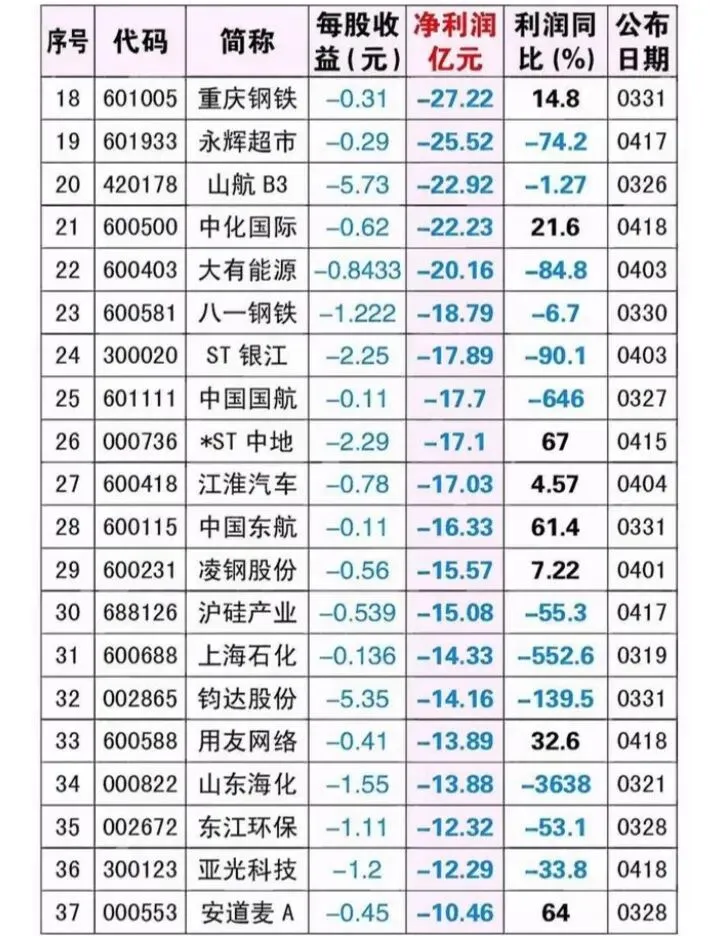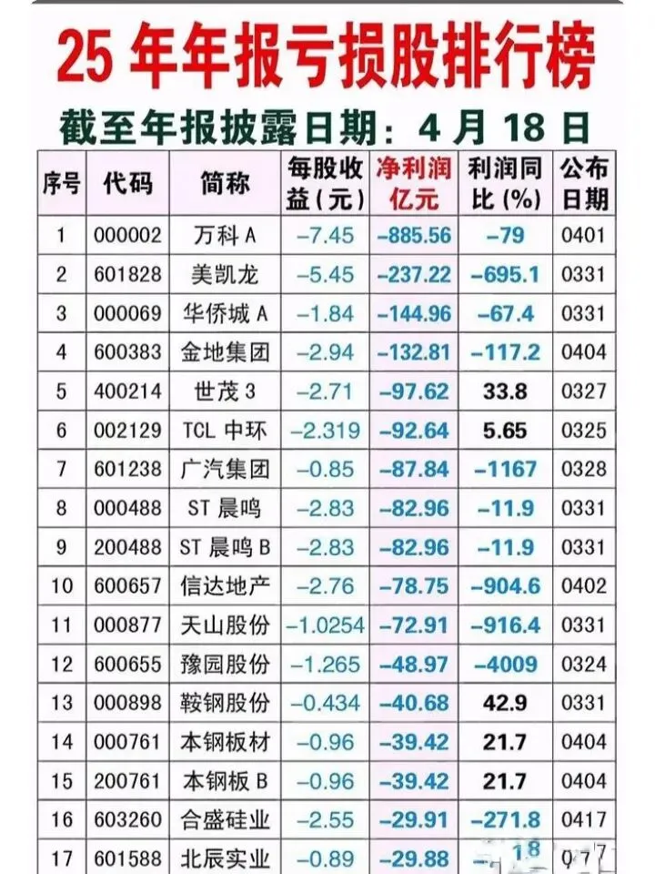 >2025年上市公司年报亏损排行榜(截至4.18)