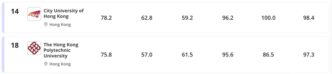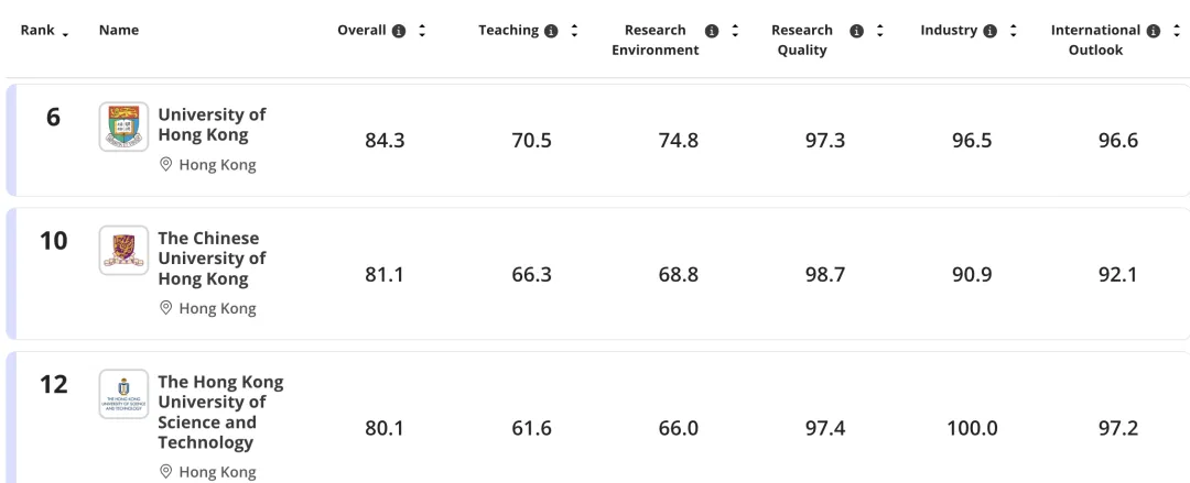 今年的排名中,中国香港共有八所大学上榜TOP100,较去年的六所有所增加,其中两所新上榜的高校直接跻身总排名百强之列。