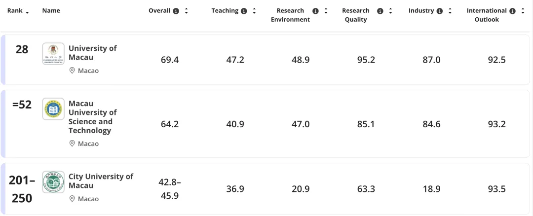 中国澳门表现最佳的高校是澳门大学,位列第28名,较去年的第34名有所提升。这是该校有史以来的最高排名,也使中国澳门高校首次跻身亚洲前30名强。