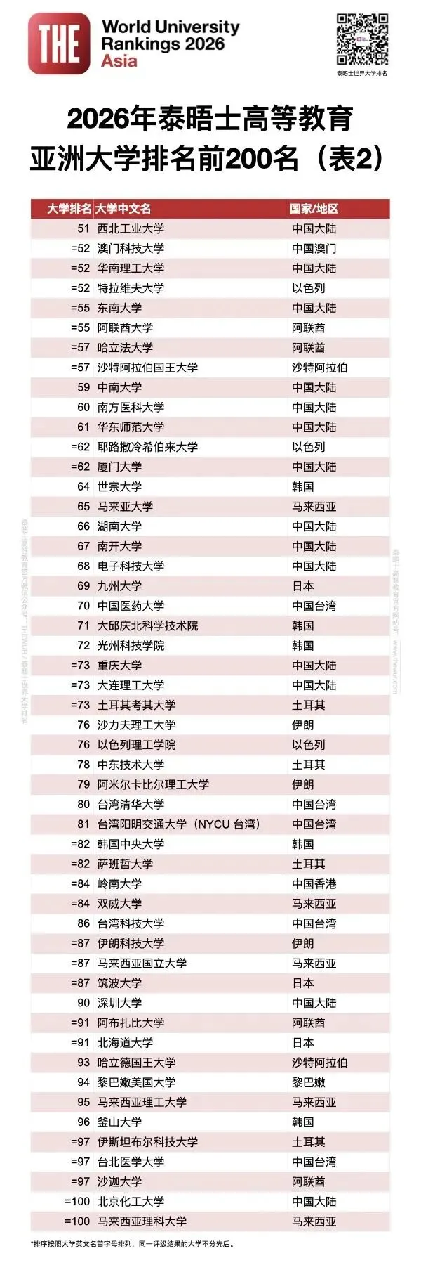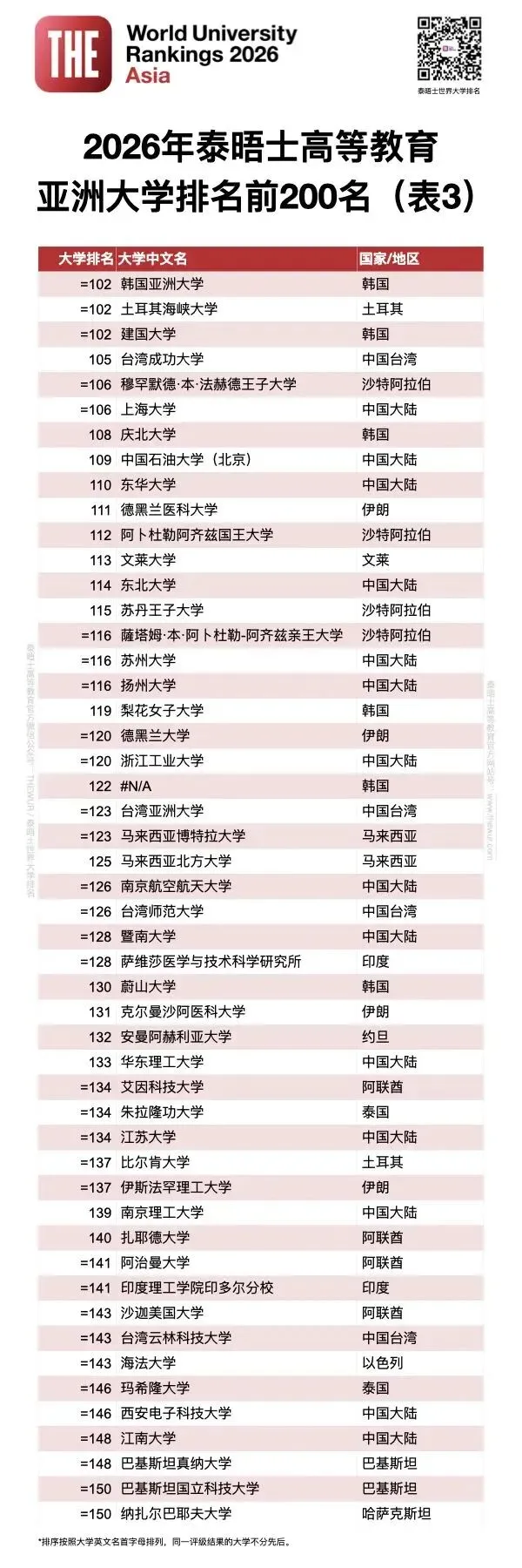 刚刚!泰晤士高等教育(Times Higher Education,THE)重磅发布《2026年泰晤士高等教育亚洲大学排名》!