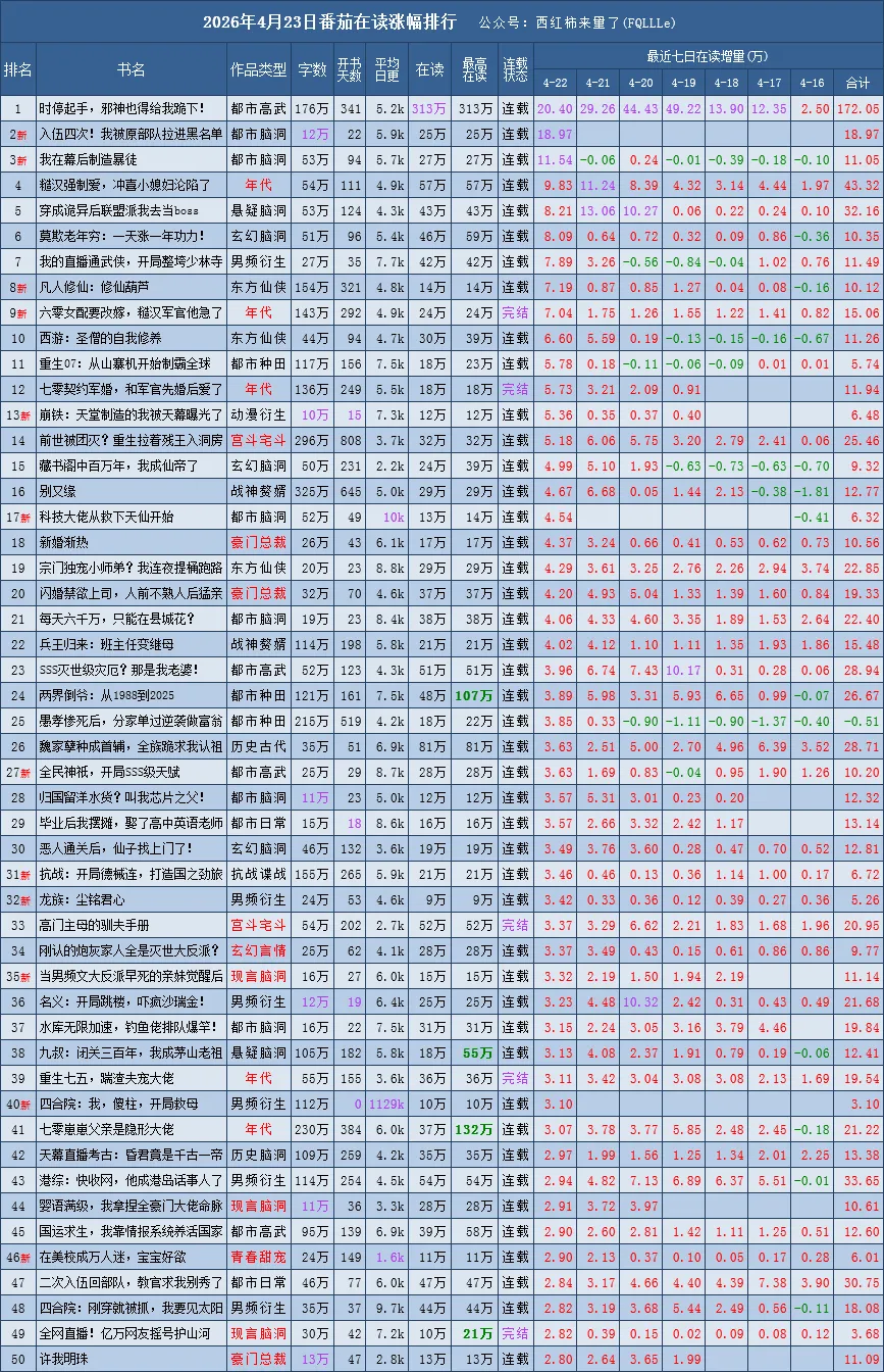 最后的8列,为最近7日的每日在读变化,以及7日的累计涨幅