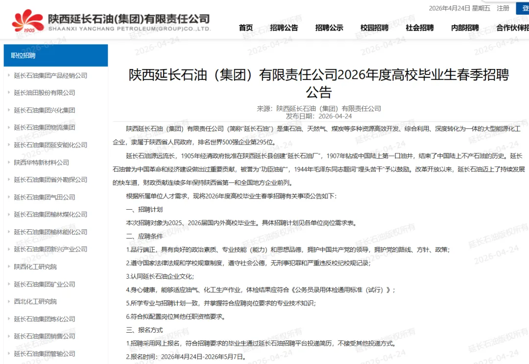 陕西本土王牌大型能源央企子级、世界 500 强 ——陕西延长石油(集团)有限责任公司2026 年度高校毕业生春季招聘全面启动,海量优质岗位、超多下属子公司可选,平台稳定、发展广阔,应届毕业生绝佳就业机会,千万别错过。