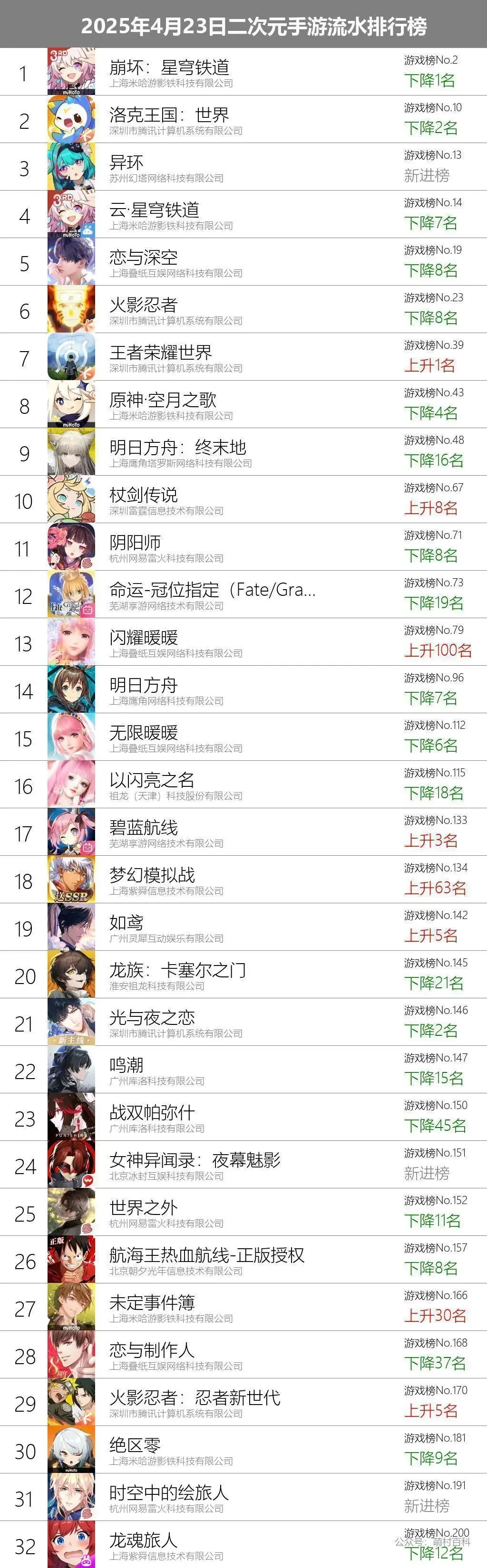 4月23日二次元手游流水排行榜。数据来源于iOS中国区畅销榜数据,数据节点为2026年4月23日22:00。