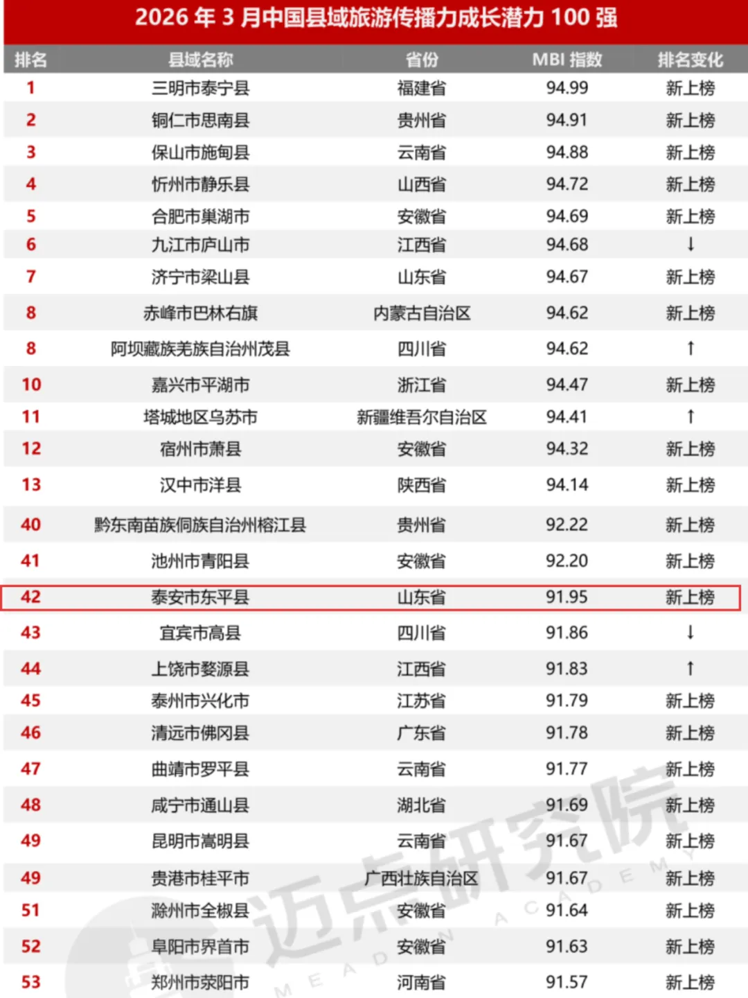 近日,迈点研究院发布2026年3月中国县域旅游传播力成长潜力百强榜,泰安市东平县以91.95分的优异成绩成功上榜,位列全国第42位。