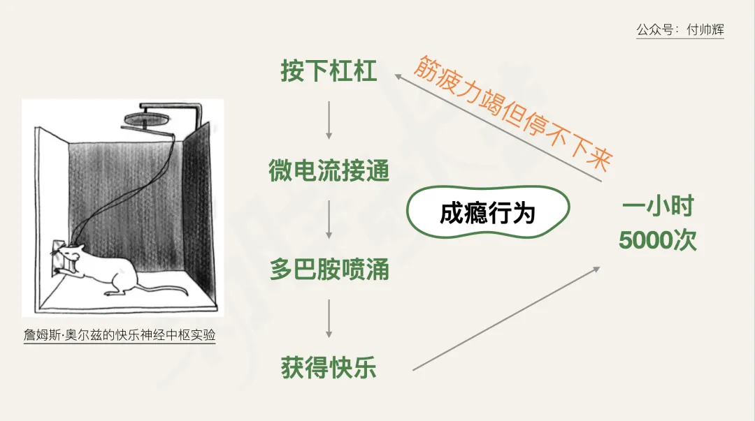 当小白鼠无意间发现了这一点之后,就会不断地去按压杠杆以获得刺激。按压频率高达每小时5000次,这是什么概念?我算了一下,相当于每秒钟按1.4次。而