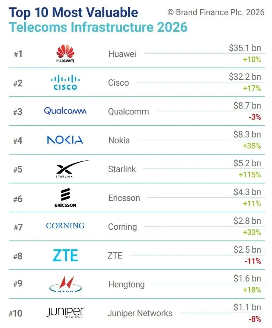 近期,英国品牌评估机构“品牌金融”(Brand Finance)发布了2026年“全球通信基础设施品牌价值10强”排行榜(Telecoms Infrastructure Brands 2026)。华为依旧高居榜首,思科、高通紧随其后,分居第二和第三位。