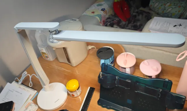 护眼灯哪个品牌最好?松下致玫护眼台灯的主要卖点在于其手势感应控制。在灯头上方挥动手,不需要接触,它就能自动调节亮度档位,这个功能确实有科技感和便利性。除此之外,它的基础亮度非常高,中心照度达到2045lux,能照亮大约1.3米宽的桌面,非常适合需要超高亮度的精细作业场景,就是直发光的设计可能会导致出现局部眩光。