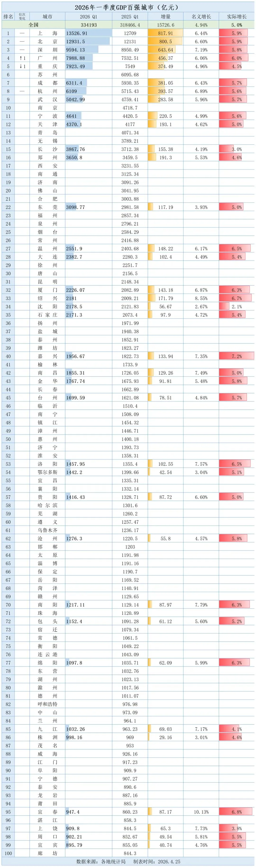 >2026年一季度GDP百强城市更新中:郑州、石家庄、鄂尔多斯、沧州出炉
