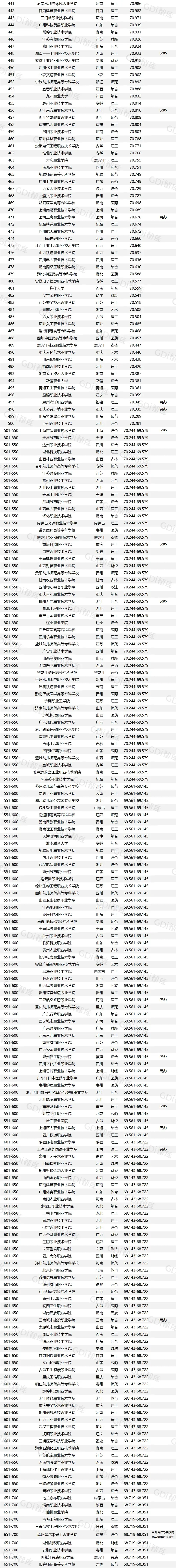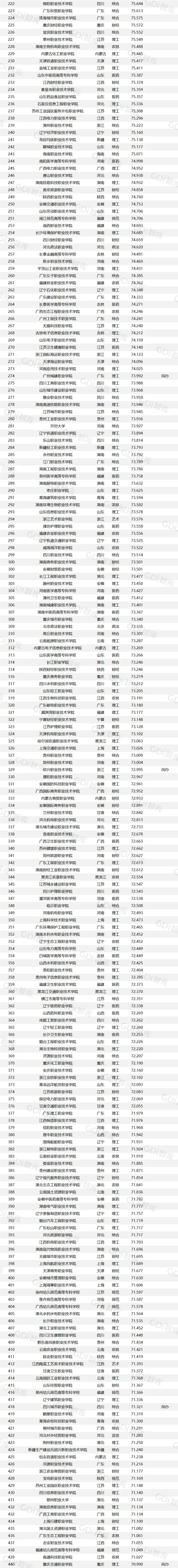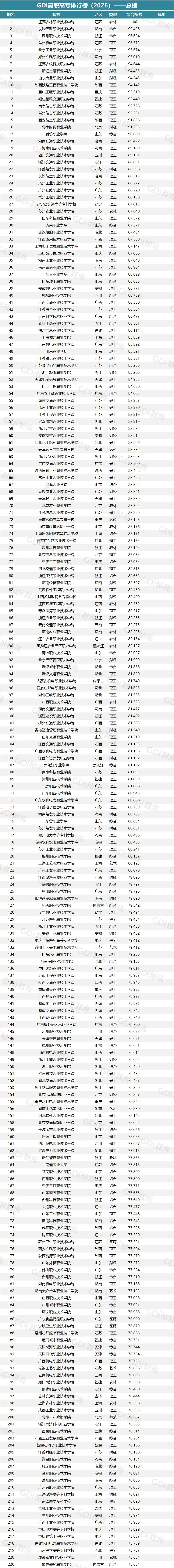 GDI高职高专排行榜(2026)—总榜上榜院校1300所,其中公办院校1040所、民办院校257所、中外合作办学及内地与港澳合作办学院校3所。榜单对前500所给出具体排名,后800所采用区间排名。总榜排名前三的院校分别是江苏农林职业技术学院、长沙民政职业技术学院、温州职业技术学院,排名4—10位的分别是常州机电职业技术学院、北京工业职业技术学院、郑州铁路职业技术学院、江苏农牧科技职业学院、浙江金融职业学院、山东商业职业技术学院、陕西铁路工程职业技术学院。