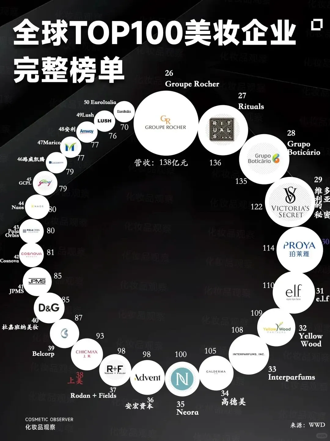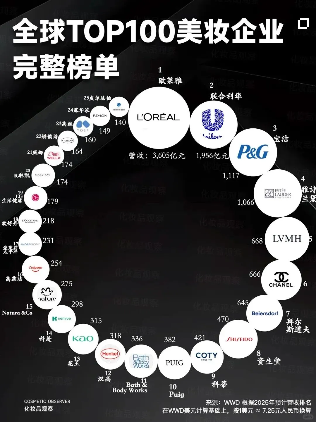 近日,WWD发布最新全球美妆百强榜。前十强座次未变,但内部分化剧烈:欧莱雅将第二名甩开228亿美元,头部地位更趋稳固;Puig、香奈儿、拜尔斯道夫增长强劲,而资生堂、科蒂、雅诗兰黛陷入负增长。预计2026年TOP5至TOP10格局将迎来新一轮洗牌。