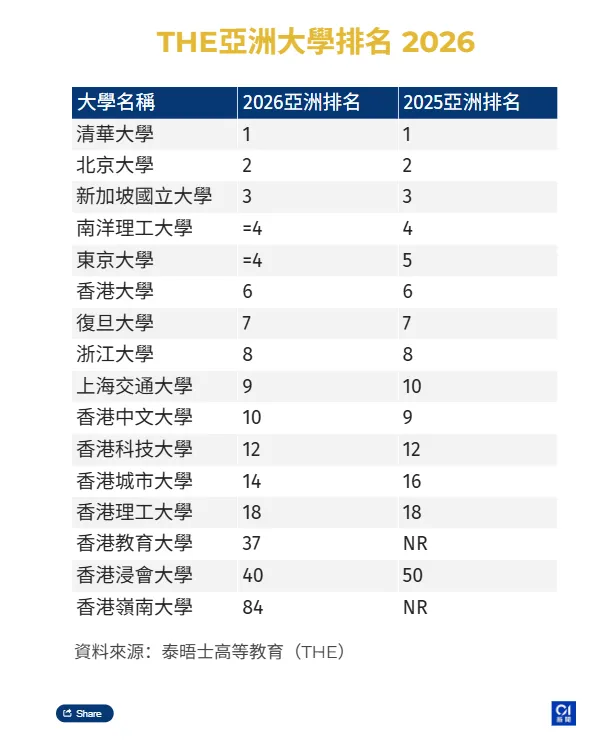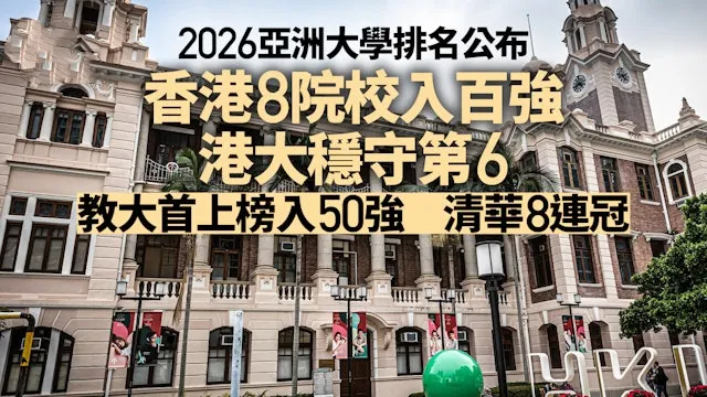 泰晤士高等教育(Times Higher Education,THE)公布2026年亚洲大学排名,清华大学连续第八年蝉联榜首。本港今年有8间院校打入首100位,亦首有7间大学晋身首50名,比去年多一间。其中港大保持第6名,中大跌一位至第10名,科大继续排第12名。新上榜院校分别是教大,排名第37,岭大排名第84位。
