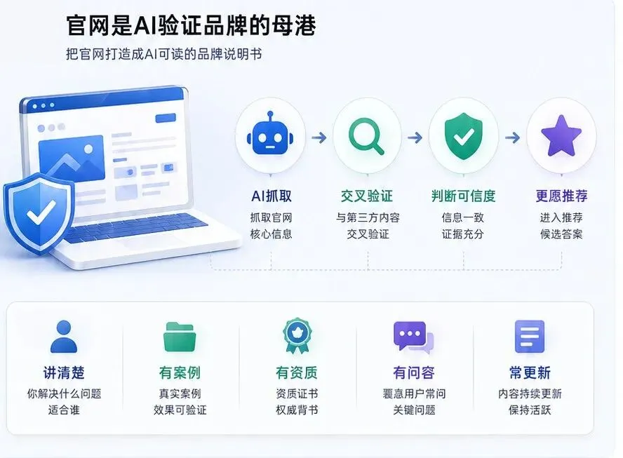 官网是AI交叉验证品牌信息的重要入口。如果官网都讲不清楚你是谁,外面发再多稿也没用。