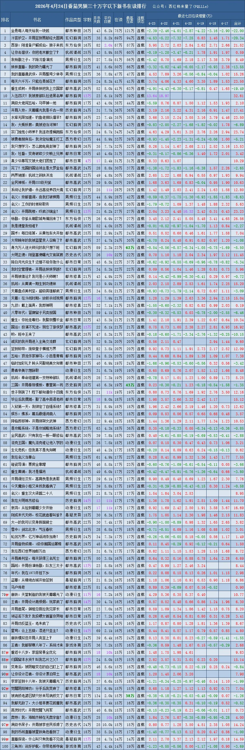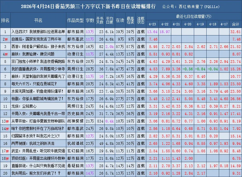 番茄新书榜范围:30万字以下、已签约未下架、已经开始推荐的且未断更,完结未超过90天的番茄原创作品
