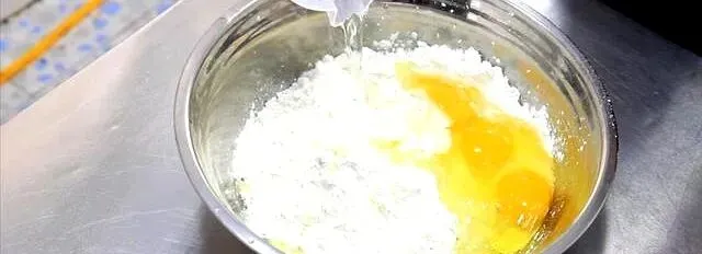 1.盆里倒入300克面粉,加入3个鸡蛋,边加水边搅拌,一直将面糊变浓稠,能拉出丝即可。