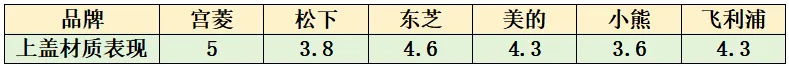 ·飞利浦、美的采用铝合金上盖,较为轻便、导热速度良好,但耐腐蚀性一般,易氧化析出有害物质,且磨损后藏污纳垢、滋生细菌,影响饮食卫生。