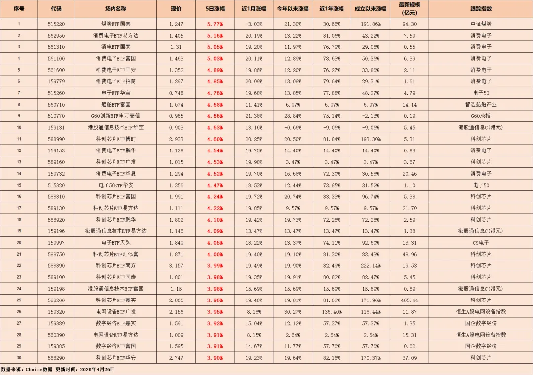 - 除此之外,煤炭ETF(国泰)以5.77%的涨幅拿下榜首,算是周期股里的独苗,短期资金博弈的痕迹很重。
