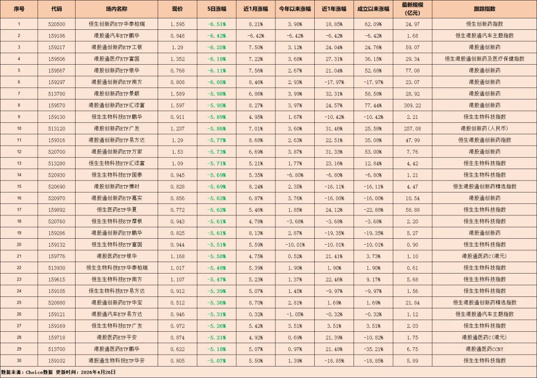 - 恒生创新药ETF华泰柏瑞直接跌了6.51%,其他港股通创新药、恒生生物科技相关ETF也普遍跌超5%。