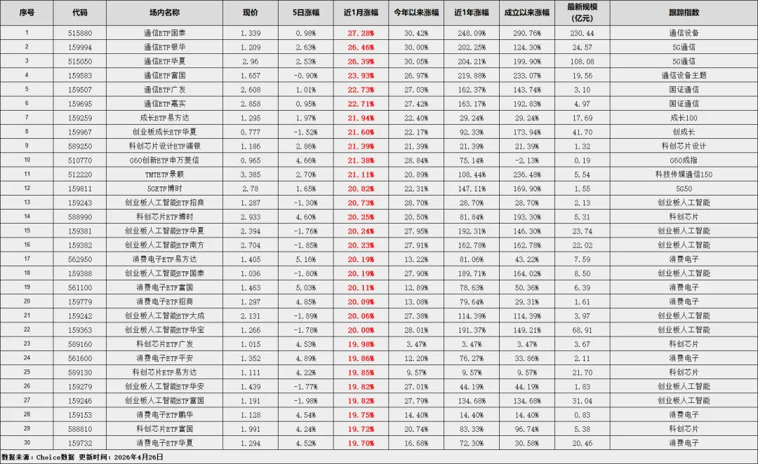 领涨榜:AI、通信是绝对主线- 通信板块是当之无愧的“王者”,国泰、银华、华夏等多只通信ETF涨幅都超过了26%,妥妥的市场最强主线,5G、光模块相关的行情持续发酵。