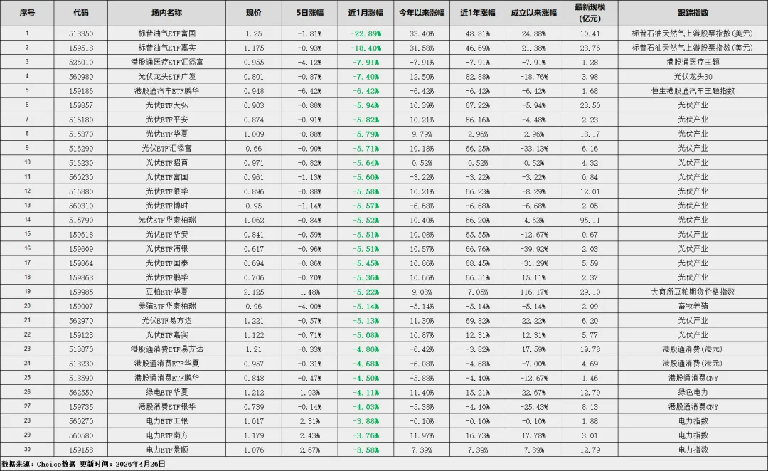 领跌榜:油气、光伏惨遭“抛弃”- 标普油气ETF富国以-22.89%的跌幅垫底,国际油价的持续下跌,直接带崩了油气相关的ETF,近一个月几乎是单边下跌。