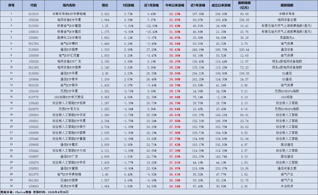 领涨榜:半导体、油气、通信三足鼎立- 中韩半导体ETF华泰柏瑞以52.23%的涨幅拿下榜首,半导体行业的景气度回升,叠加AI算力的需求爆发,直接带飞了整个板块。