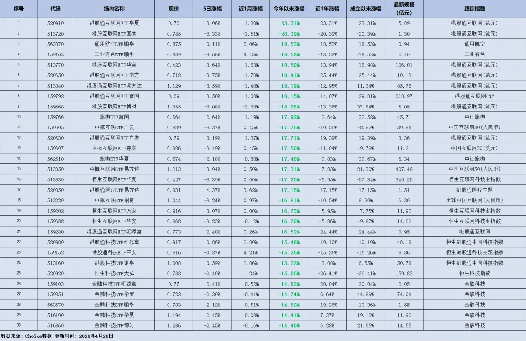 领跌榜:港股互联网、消费持续走弱- 港股通互联网ETF华夏以-23.31%的跌幅垫底,港股互联网企业的业绩不及预期,加上流动性不足,板块持续走弱。