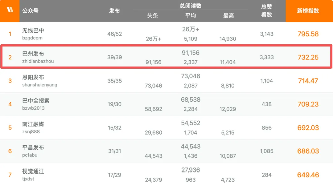 在本周媒体类榜单中,“无线巴中”以26万+次阅读量总数,795.58新榜指数领跑媒体类榜单;“巴州发布”以91156次阅读量总数,732.25新榜指数获得媒体类榜单第二名。